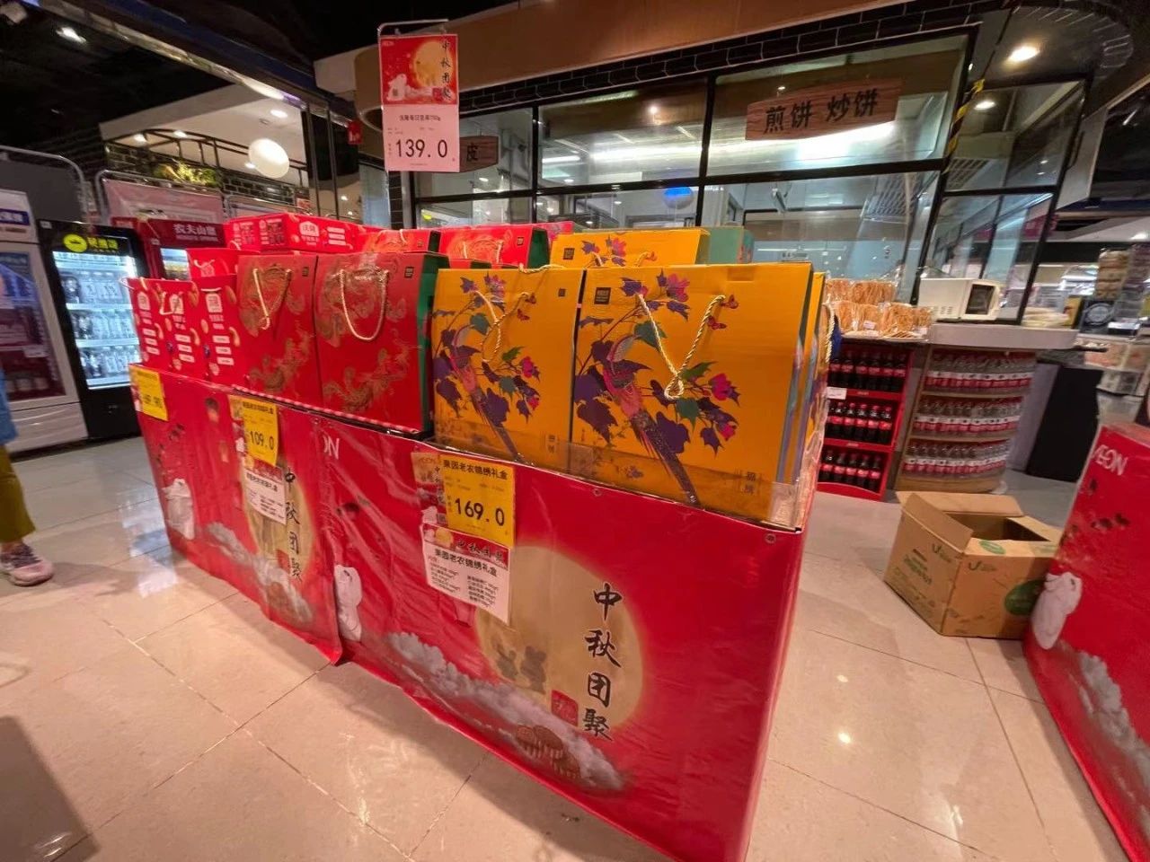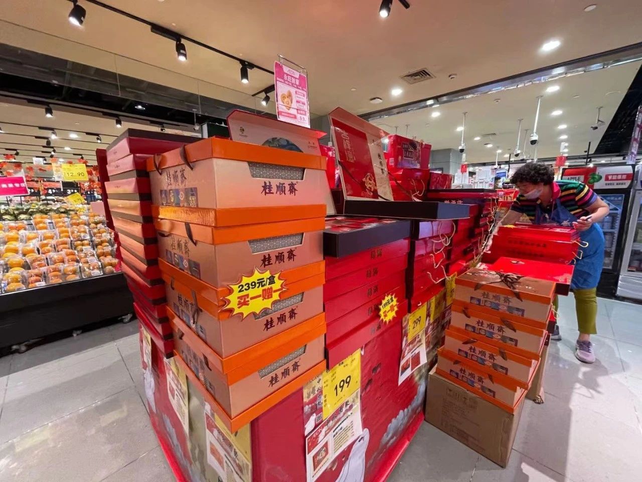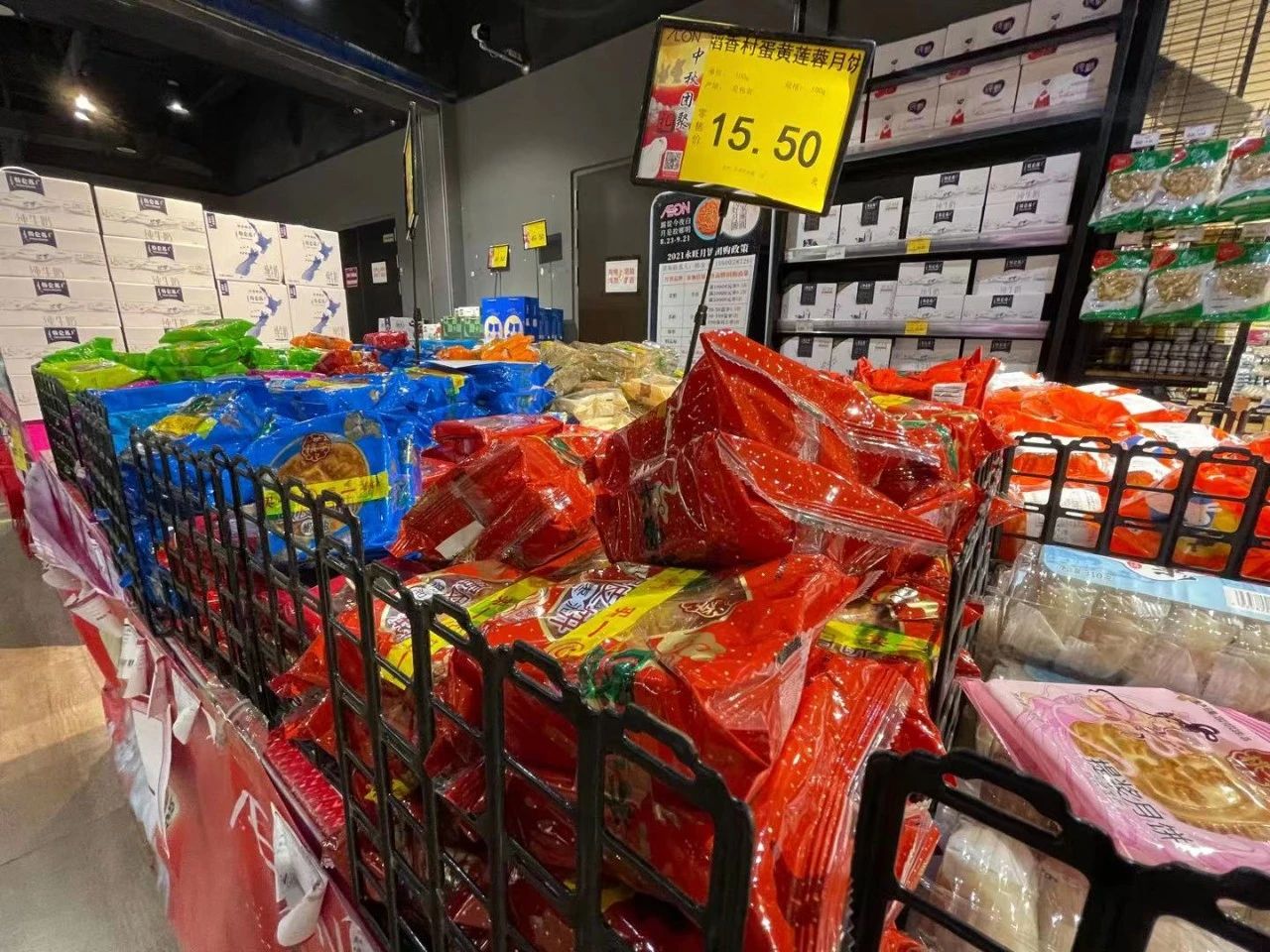 永旺超市天河城店则在入口处专门设置了月饼专区,桂顺斋、稻香村、桃李等品牌的月饼礼盒、散装月饼齐聚一堂便于消费者购买,各种口味的散装月饼,有传统的五仁、椒盐、豆沙、莲蓉等,也有各种奶黄月饼、冰皮月饼等,几十种口味让人挑花了眼。