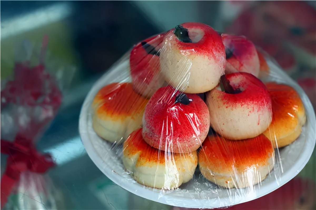 下面是柿子外形,上面是苹果外形,取谐音事事平安的点心——