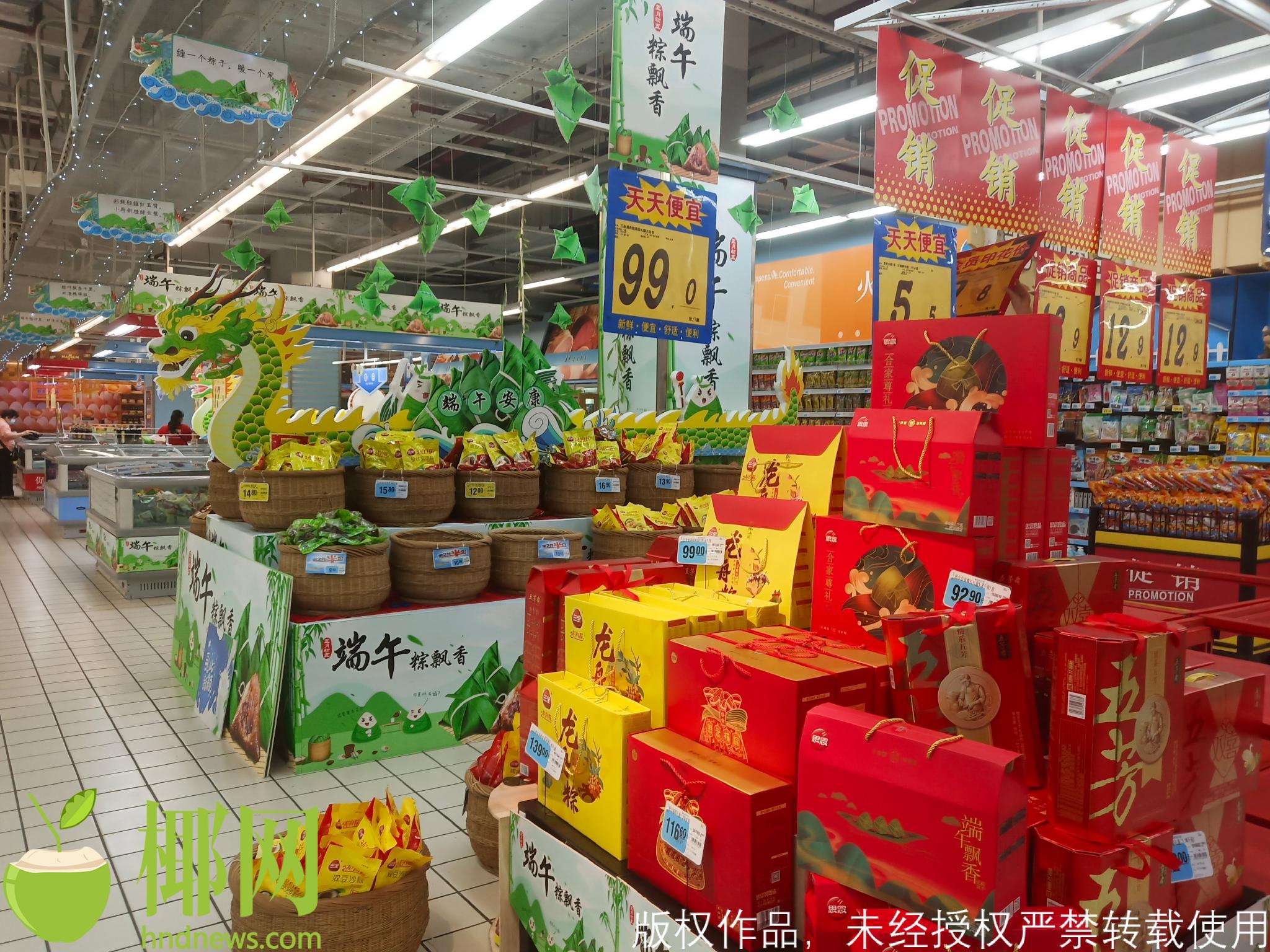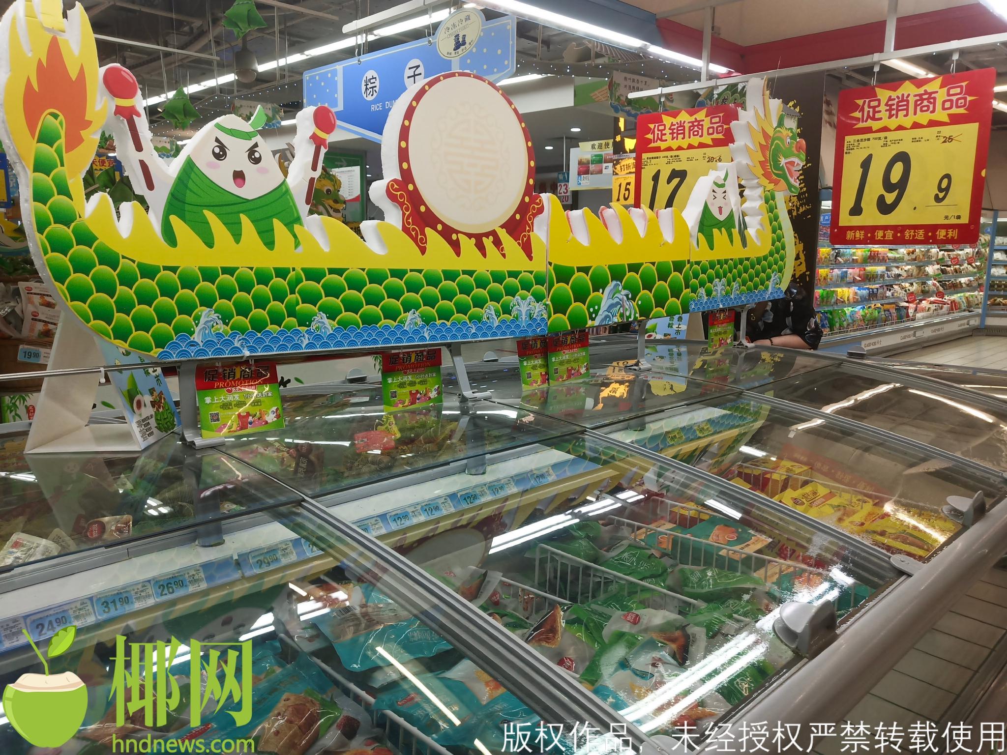 商报全媒体讯(椰网/海拔手机端记者 徐明锋 摄影报道)距离农历五月初五传统端午节还有一个月时间,5月5日,国际旅游岛商报记者走访海口多家大型商超发现,端午节必备的传统美食——粽子已经抢鲜上市,同往年一样,多数为猪肉粽,海南本地粽与内地品牌粽子同柜竞售。