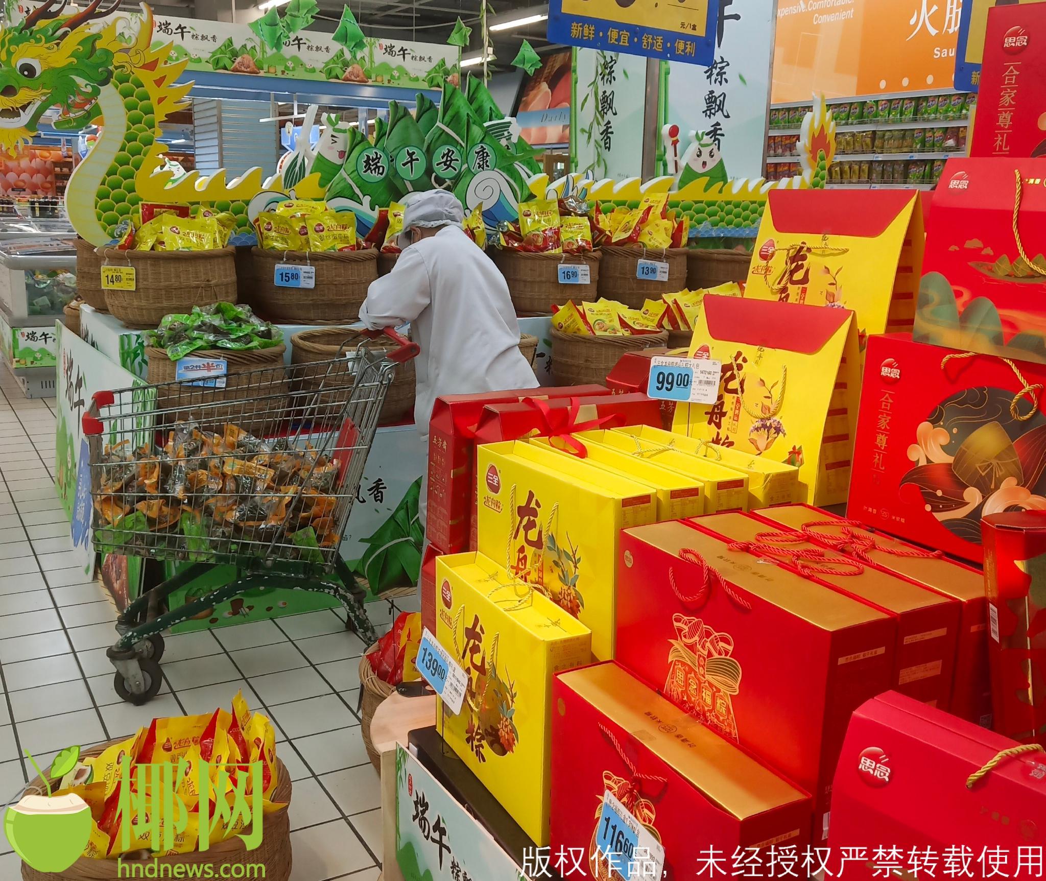 商报记者分别走访海口市海秀东路、龙昆南路、红城湖路、国兴大道上的多家大型超市,超市里洋溢着浓厚的端午节氛围,均推出以龙舟为造型的粽子一条街、粽子销售专区,货架上摆满了各种散装粽、袋装粽、礼盒粽,品牌涉及省内外,猪肉蛋黄粽、板栗粽、蜜枣粽、豆沙粽、八宝粽、甜粽、蛋黄粽、红豆咸肉粽、豆沙枧水粽等数十种口味的粽子上柜销售,其中,猪肉蛋黄粽占多数。粽子的价格各有所异,分别以盒、袋、个为单位进行销售,可满足不同消费群体的需求,吸引消费者驻足选购。