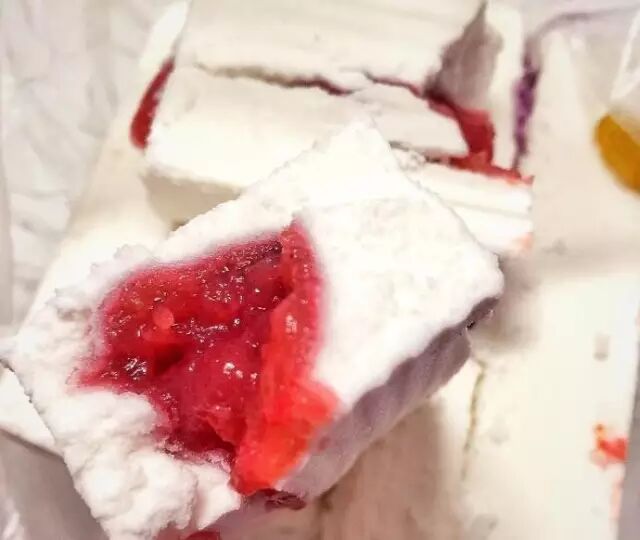 一共五种口味,豆沙、草莓、红果、蓝莓、菠萝。 本人爱豆沙和蓝莓,其他口味也爱吃,由于是刚出炉糕干很松软,咬一口馅料就出来了,不是很甜,但味道很正宗。