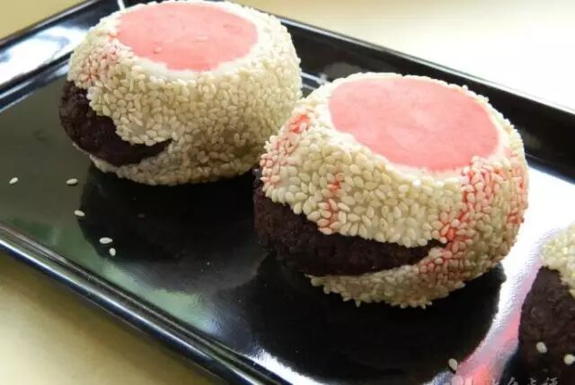 传统的蛤蟆吐蜜,是红豆沙馅儿的,模样很是俏皮,因烤制而自然裂开的口子有豆沙馅溢出,活像蛤蟆在吐舌头~外部包裹着满满的香芝麻,一口咬下去,能同时感受到豆沙的甜蜜和芝麻的焦香~
