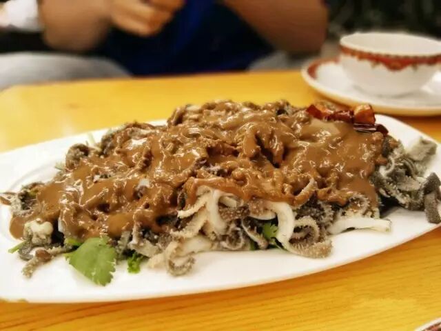 水爆肚,火侯正好,不老不生,配上浓浓的麻酱,辣油,香菜,送上桌以后将他们自己拌好,吃上一口,那叫一个过瘾!