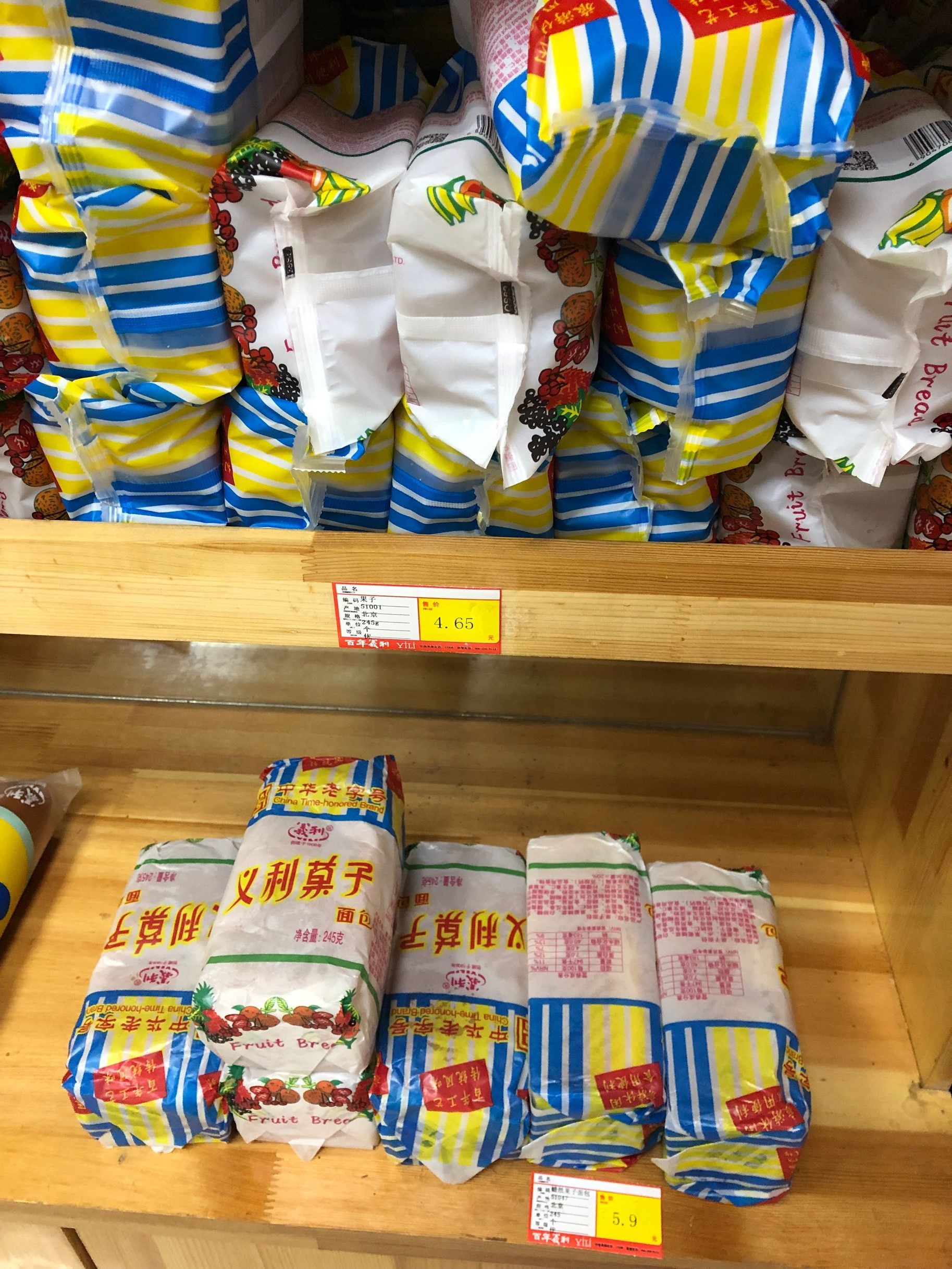 面包区,有黄油面包,葡萄面包,红果面包,乳白面包,还有我们小时候春游带的维生素面包和父母辈喜欢的果子面包。塑料包装的维生素面包2块,蜡纸包装3.4。果子面包塑料包装是4.65,蜡纸包装是5.9。现在看维生素面包还是挺亲切的,不只是义利店里有卖,超市也有,隔不久逛超市的时候看到维生素面包就会买一个回去,可能是一种情怀吧。