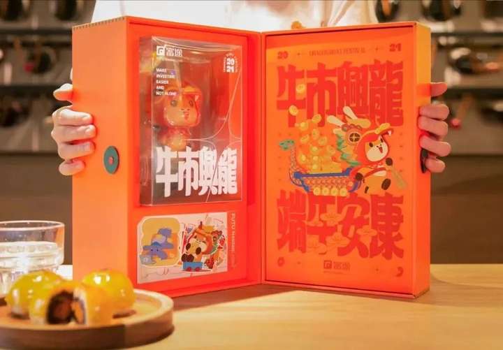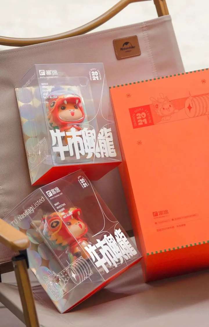 富途的礼盒祝福贴心,牛市兴龙可能是每个投资人想看到的。里面配套的是轩妈蛋黄酥。橙红色的礼盒和牛牛定制玩偶,所有好的寓意都一起送给你。