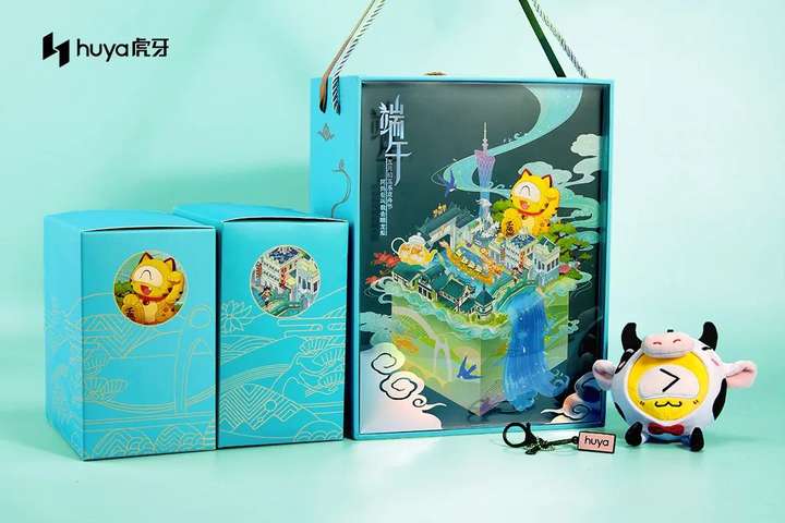虎牙的礼盒主题是岭南好风光。礼盒外形设计中添加了祥云和喜鹊等元素。正面是将深圳塔等现代元素与传统古城结合的手绘画,呼应主题。里面内容就比较中规中矩了。可咸可甜的粽子、咸鸭蛋和定制公仔。