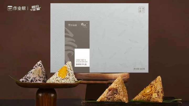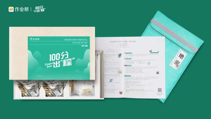 作业帮今年与锋味出了联名端午礼盒。4种口味粽,搭配可以diy的甜粽,和100分系列的电脑包和和试卷,是有新意的知识粽了。