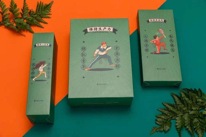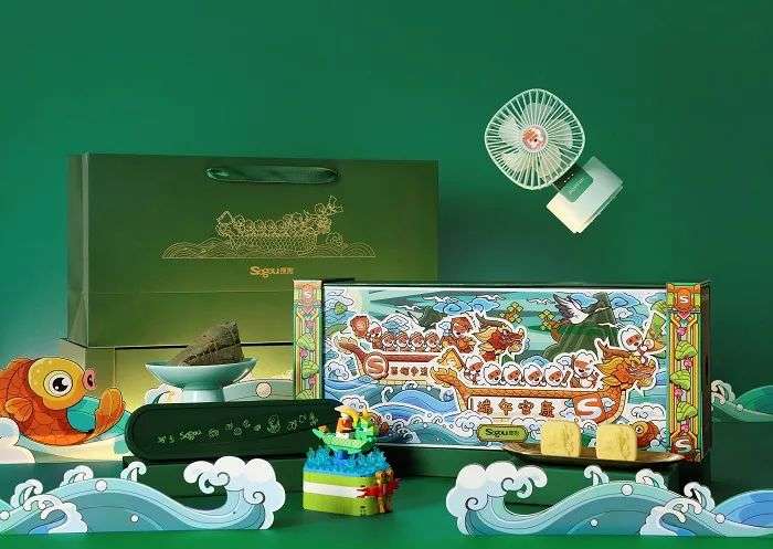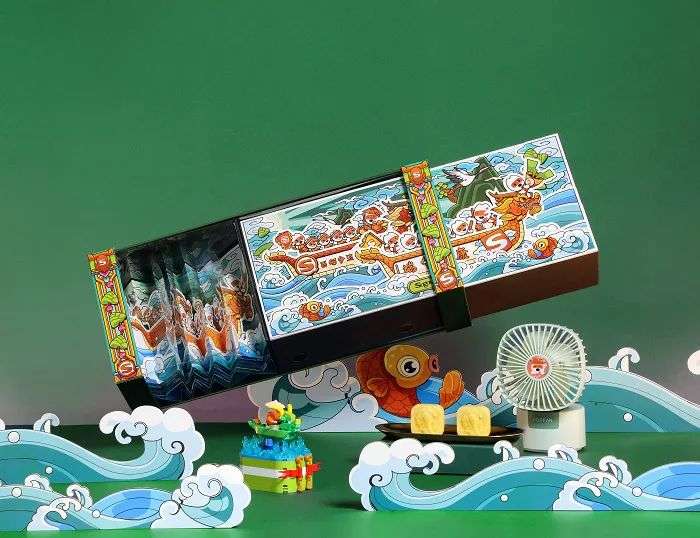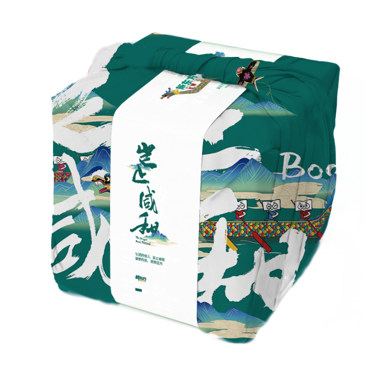 今年礼盒主要采用了粽叶绿的色调。礼盒外观是赛龙舟的景象,将公司IP形象和端午很好的结合起来,抽屉式设计的礼盒拉出来就可看到立体的插画图像,生动有趣。