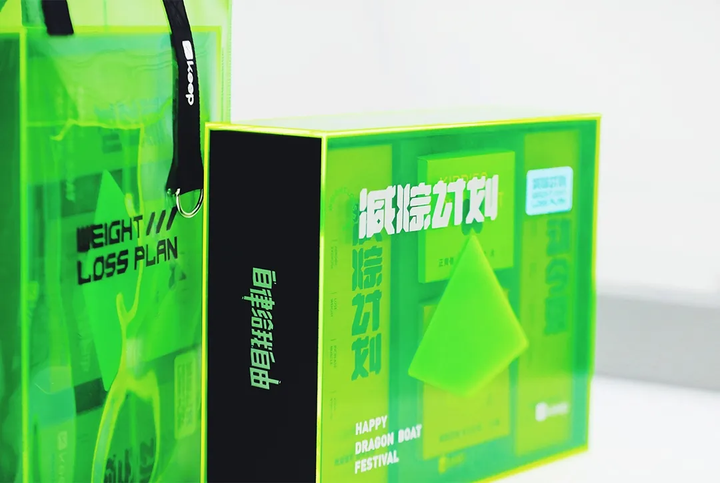 keep礼盒主题一如既往符合品牌形象。采用荧光绿透明手提袋,传递健康锻炼的理念。礼盒包括低脂粽,减粽哑铃和定制手链。过节也不会让你随意放纵自己哦~
