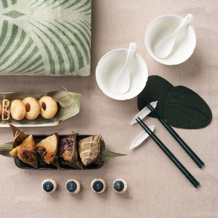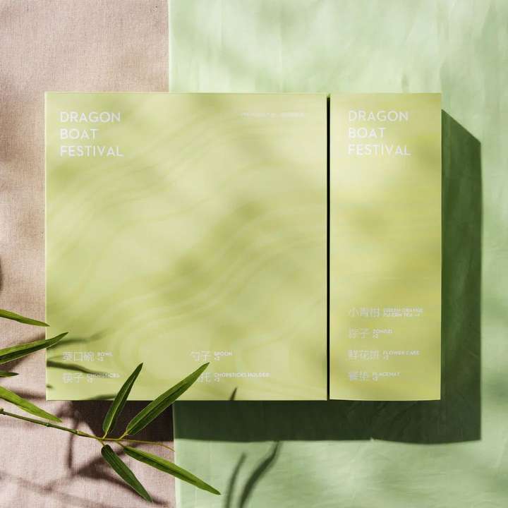 银灰色和荧光绿编制而成手提纸袋,增添礼盒更多清爽的气息。盒内有5种口味的粽子,还有柚子接骨木味的鸡尾酒和泡澡球,给予你更多夏日活力。