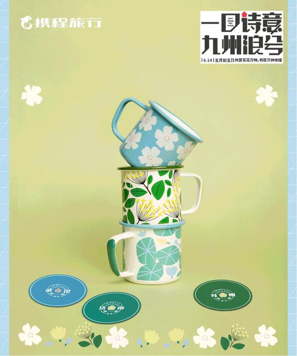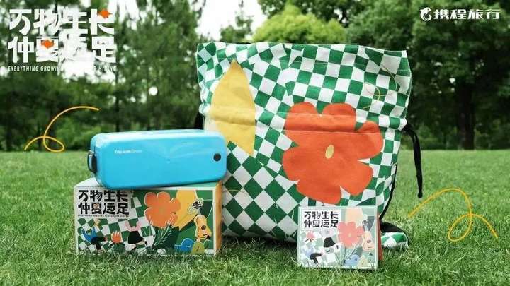 万夏正是远足好时节。礼盒外包装采用格纹和小花图案背包,青草绿为主色调。包含了九大旅行地点的搪瓷茶杯盲盒、祈愿风铃,和远足必备的野餐盒,很符合品牌的定位和形象。