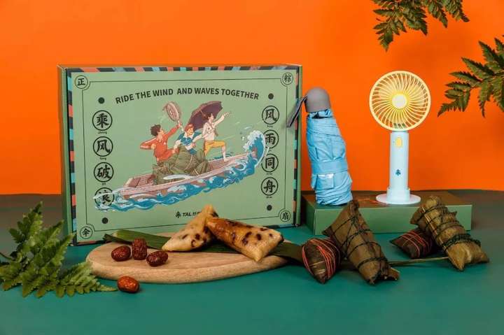 呼应主题,夏日必备的雨伞和风扇都在礼盒中,当然还有必不可少的粽子。礼盒封面结合主题手绘端午图案,也表达了希望可以和员工们创造更好未来的期许。