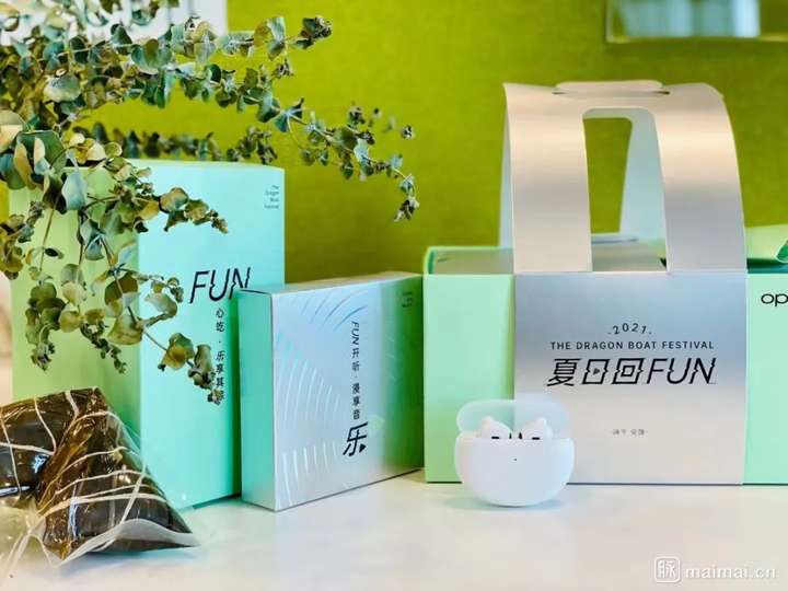 礼盒采用了薄荷绿与冰川银进行碰撞,打造出夏天的清爽感。配合主题,今年是粽子+无线耳机,让你在端午也可以浸享音乐。