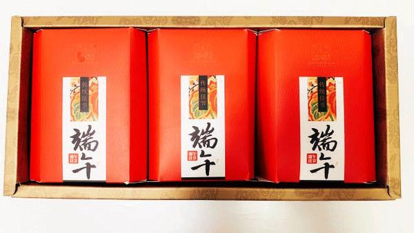第三层为同样以吉祥红为盒底色,以皇家奏折风为主要设计灵感,苏式刺绣花纹,酿造出精致好礼,此为咸甜粽惊喜礼。