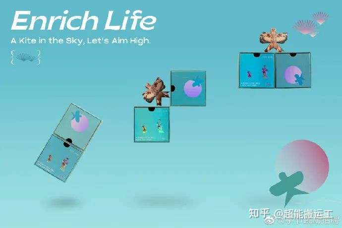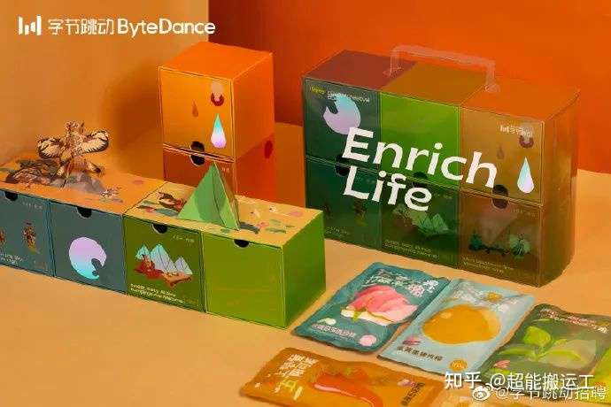 今年字节的端午礼盒名为Enrich Life,配色活泼得一比,主色调为夏日绿,且6种口味的粽子都单独进行了包装。