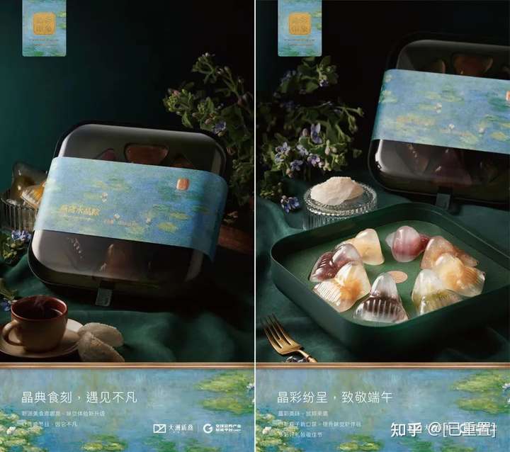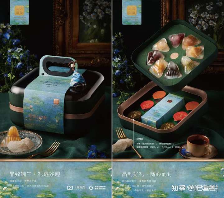 ▲ 礼盒腰封,摹形取意印象派莫奈名作《睡莲池》,水光花影,赴「粽」夏夜之梦。以美为名,绘画与美食,西方艺术与东方传统,产生跨界的相通感应。