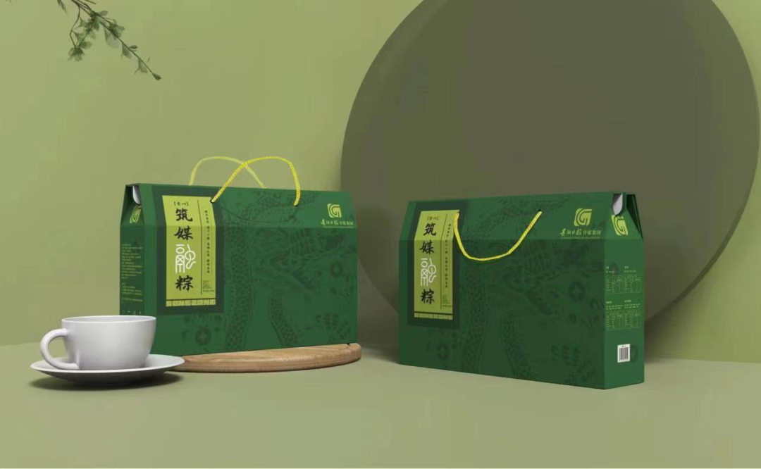 黔式布依粽其礼盒包装,整体调性简约且具有民族风范。其外包装暗纹龙影翻腾,龙影争渡,呈现一股拼搏之力与龙舟精神相得益彰。在此基础上,加以钱币增彩,钱同音黔,既代表黔式布依粽,也代表财富。龙腾追钱(黔),寓意拥有源源不断的钱财,也包含得到美味可口的布依粽。