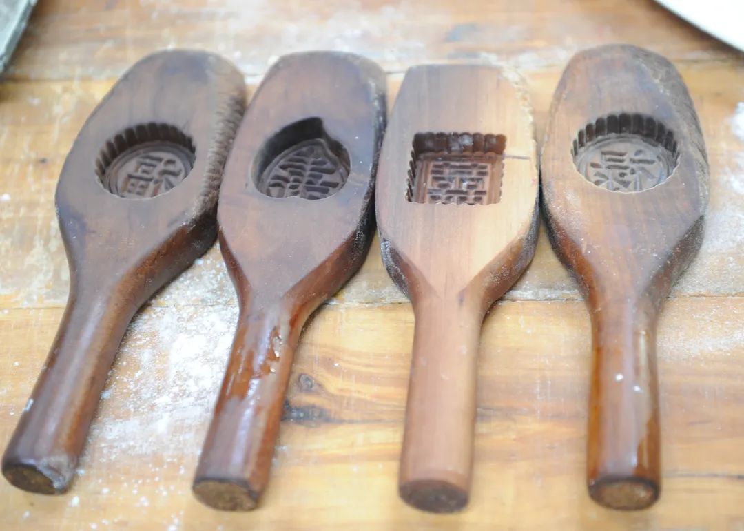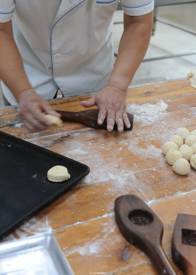 8.做模:将包好的糕点放到相应的模具中压模成型。